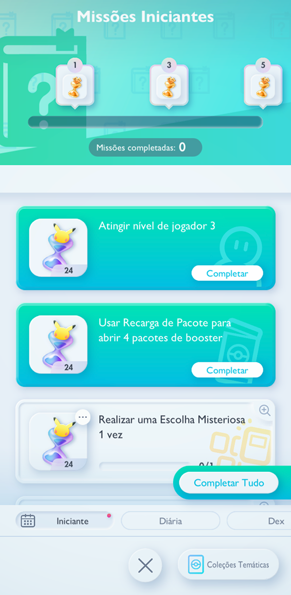 Não deixe de acompanhar seu progresso de missão e resgatar quaisquer Ampulhetas de Pacote que você conseguir. Dessa maneira, você alcançará o nível 3 em um piscar de olhos e estará com tudo pronto para as suas primeiras batalhas no Pokémon Estampas Ilustradas Pocket.