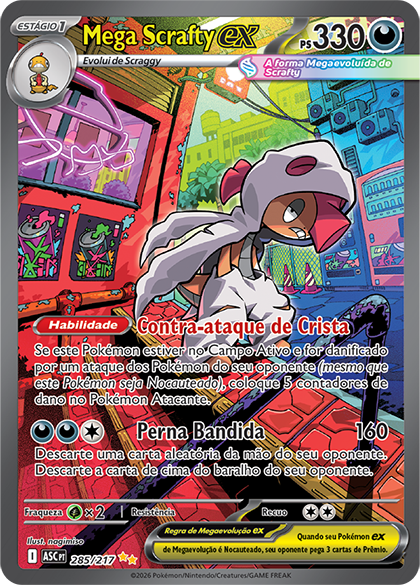 O ilustrador nagimiso costuma criar cenas em que Pokémon e Treinadores estão em ação, seja em movimento ou exibindo um ataque incrível. Mas sua mais recente Ilustração Rara Especial é um pouco diferente. Com Mega Scrafty, o estilo de nagimiso destaca o lado discreto e alternativo do Pokémon de Megaevolução em um cenário urbano vibrante, repleto de cores. É uma vibe única.