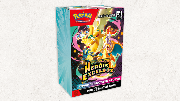 É claro que os pacotes de booster da expansão Megaevolução — Heróis Excelsos estão disponíveis em diferentes coleções, mas às vezes isso simplesmente não é suficiente. Felizmente, os combos de pacotes de booster trazem 18 pacotes de booster da expansão Megaevolução — Heróis Excelsos em uma única embalagem, o que é super prático. Quais cartas você vai encontrar? Só tem um jeito de descobrir!