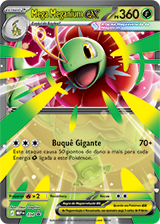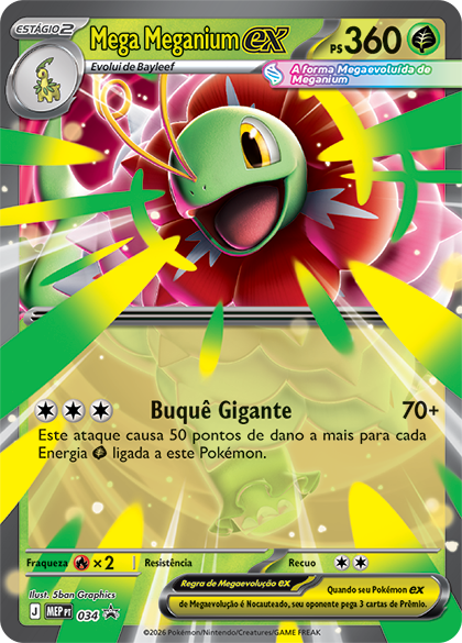 Qual Pokémon você vai escolher? Desabrochando com um novo poder, Mega Meganium ex presenteia os Pokémon do seu oponente com um Buquê Gigante que poliniza a batalha com danos impressionantes. Cercado por chamas, Mega Emboar ex provoca uma Explosão Carmim para devastar seu oponente. E com dentes e garras afiados, Mega Feraligatr ex mira nos Pokémon enfraquecidos do seu oponente e dá uma Mastigada Mortal!