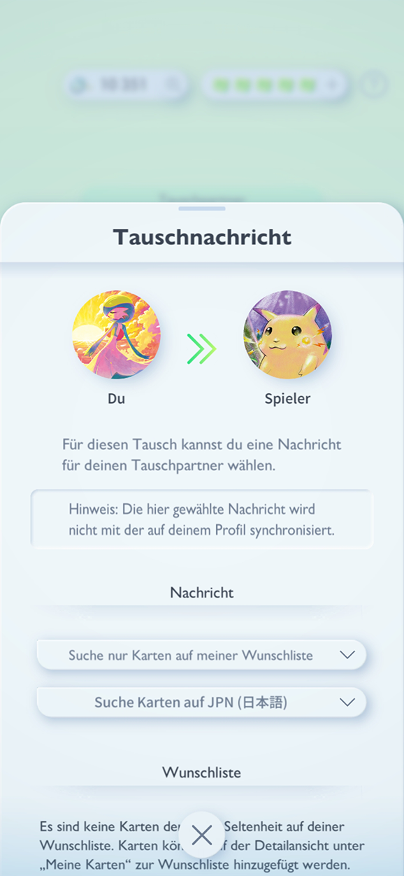 Darüber hinaus wurden dem Tauschen und Kämpfen zwei neue Funktionen hinzugefügt. Beim Tauschen kannst du nun eine Nachricht für deinen Tauschpartner auswählen, wodurch du kommunizieren kannst, wonach du suchst, z. B. Karten auf deiner Wunschliste, Karten in einer bestimmten Sprache und mehr!