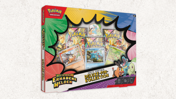 Bevor dein neues Abenteuer beginnen kann, muss du dich erst einmal für ein erstes Partner-Pokémon entscheiden! In dieser Box kannst du dich mit dem Pflanzen-Pokémon Endivie, dem Feuer-Pokémon Floink und dem Wasser-Pokémon Karnimani anfreunden, die hier als holografische Promokarten und als glänzender Deluxe-Pin erscheinen, auf dem alle drei Pokémon gemeinsam abgebildet sind. Erhalte außerdem fünf Boosterpacks der Erweiterung Mega-Entwicklung – Erhabene Helden!