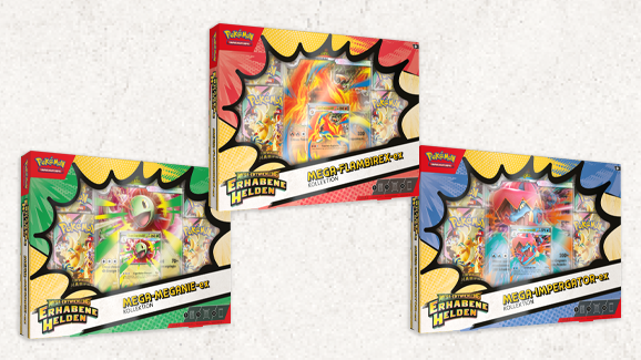 Schmiede eine Bindung, durch die dein Partner-Pokémon mithilfe der Mega-Entwicklung über seine Grenzen hinauswächst! In diesen Kollektionen erwarten dich Mega-Meganie-ex, Mega-Flambirex-ex oder Mega-Impergator-ex als spielbare holografische Promokarte, eine überdimensionale Wackelbildkarte mit dynamischer Illustration und vier Boosterpacks aus der besonderen Erweiterung Mega-Entwicklung – Erhabene Helden.