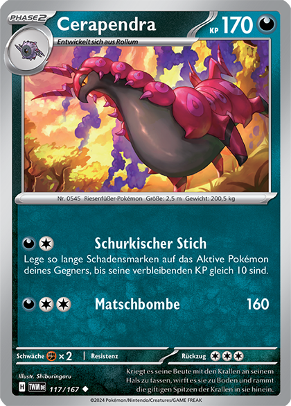 Cerapendra ist die furchteinflößendste Kreatur mit seiner Attacke Schurkischer Stich, die die KP deines Gegners auf 10 reduziert – niedrig genug für einen K.-o.-Treffer durch Giftschaden zwischen den Runden. Yveltal kann die Spannung für deine Gegner auch mit einem ruinierenden Szenario für vergiftete Pokémon verstärken, da seine Attacke Greifer das Verteidigende Pokémon daran hindert, sich zurückzuziehen.