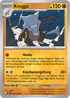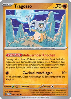 -Pokémon zu wollen: Knoggas Attacke Knochenvergeltung. Falls auf einem deiner Tragosso auf der Bank Schadensmarken liegen, verursacht der Angriff 120 zusätzlichen Schadenspunkte. Darüber hinaus hilft Tragossos Fähigkeit Anfeuernder Knochen Knogga dabei, dem Aktiven Pokémon deines Gegners 30 zusätzliche Schadenspunkte zuzufügen – dieser Effekt stapelt sich mit jedem Tragosso, das du auf deiner Bank hast. Spiele einen Premium Power Pro für potenzielle 300 Schadenspunkte, bevor Schwäche und Resistenz verrechnet werden. Das ist ein ziemlicher Knaller für ein Phase-1-Pokémon!