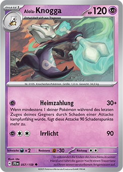 Alola-Knogga hat im Vergleich dazu weniger Durchschlagskraft, aber es liefert phänomenal fatale Vibes, die in geistreichen Decklisten wie dieser einfach erforderlich sind. Heimzahlung ist eine hervorragende Geschichte der Rache und verursacht bis zu 120 Schadenspunkte, wenn eines deiner Pokémon während des letzten Zuges deines Gegners durch Schaden einer Attacke außer Gefecht gesetzt wurde.