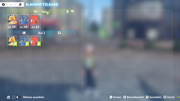 Zuerst musst du ein Kampfteam erstellen. Rufe dafür im Menü deine Boxen auf und drücke anschließend zwei Mal den X-Knopf, um vom Team zum Kampfteam zu wechseln. Erstelle dein Kampfteam für Rangkämpfe, indem du drei Pokémon aus deinen Boxen auswählst. Du kannst keine Pokémon auswählen, die sich derzeit in deinem Team befinden, also schicke alle Pokémon, die du in Rangkämpfen einsetzen möchtest, zuerst in deine Boxen.