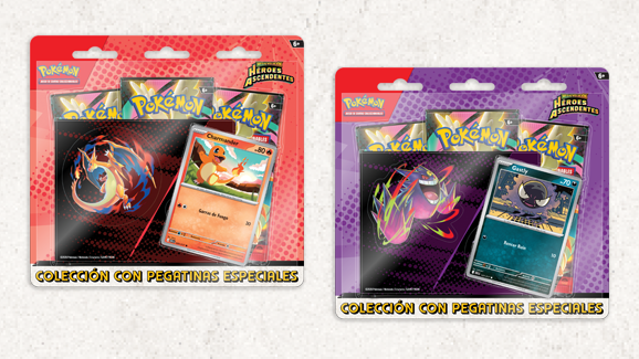 Los Pokémon de Kanto ascienden a lo más alto, ¡tanto cuando aparecen en cartas de promoción como en pegatinas especiales! En esta colección, encontrarás a Charmander o a Gastly en forma de carta holográfica de promoción, así como una hoja con pegatinas especiales de Charmander y Mega-Charizard Y o de Gastly y Mega-Gengar. Y, por si esto fuera poco, ¡descubre aún más Pokémon en los tres sobres de mejora de la expansión Megaevolución-Héroes Ascendentes!