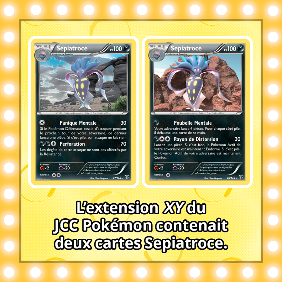 Vous aurez certainement remarqué que dernièrement, Sepiatroce occupe beaucoup nos esprits… Cela s’explique peut-être par la vidéo « Mon ami Sepiatroce » qui dévoile un étrange phénomène. Si vous aussi, vous nourrissez une obsession pour Sepiatroce (… le boss), consultez notre liste des plus belles cartes du JCC Pokémon et découvrez-en plus sur Sepiatop et Sepiatroce dans les jeux vidéo.