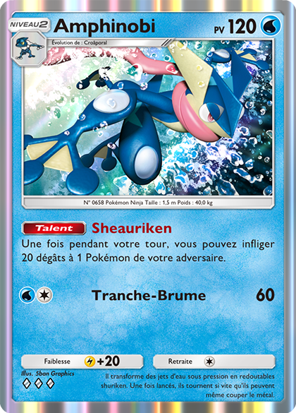 Il est évidemment impossible de prédire la réaction de votre adversaire une fois que Suicune-ex sera sur le Poste Actif : il lui est possible de réduire les dégâts de Valse de Cristal en évitant de placer des Pokémon sur le Banc par exemple. C’est là qu’Amphinobi entre en jeu avec son talent Sheauriken, qui peut infliger 20 dégâts à un Pokémon adverse, même lorsqu’il est sur le Banc. Si vous ciblez un Pokémon de Banc de votre adversaire, vous pourrez ensuite utiliser Hélio pour l’envoyer sur le Poste Actif et le mettre K.O. rapidement avec une attaque de Suicune-ex.