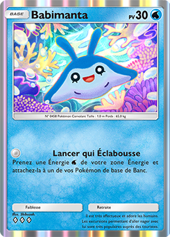 Stratégie : l’idéal est d’avoir Babimanta et Suicune-ex dans votre main de départ. Placez Babimanta sur le Poste Actif et Suicune-ex sur le Banc afin que Babimanta lui offre une Énergie
