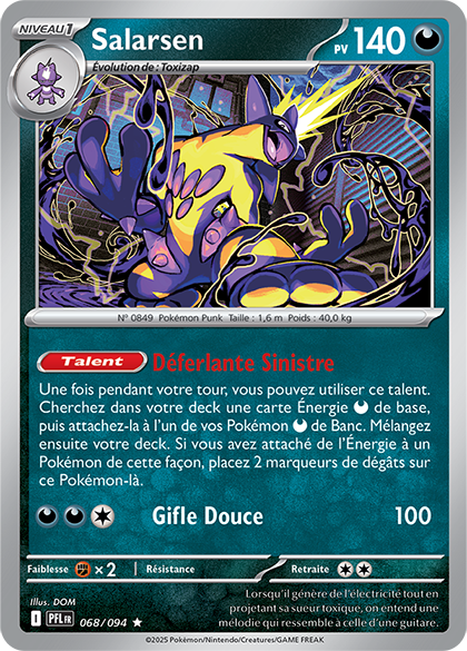 Je regroupe Méga-Sharpedo-ex et Salarsen car ils forment un duo puissant dans un deck. Le talent Déferlante Sinistre de Salarsen vous permet de chercher dans votre deck une Énergie Obscurité de base et de l’attacher à l’un de vos Pokémon Obscurité de Banc, en plaçant également deux marqueurs de dégâts sur lui. Si ces dégâts sont habituellement considérés comme un inconvénient, ce n’est pas le cas dans le format Standard d’aujourd’hui.
