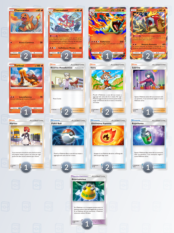 Strategia di gioco: Mega Charizard Y-ex è la star di questo mazzo e le altre carte hanno lo scopo di aiutare il Pokémon Fiamma a prepararsi dalla panchina. Essendo un Pokémon di Fase 2 che richiede quattro Energie (![]()