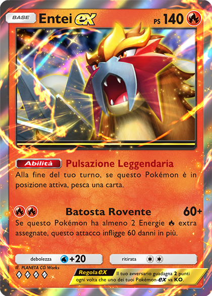 Entei-ex apre la lotta e, grazie alla sua resistenza, è in grado di incassare i colpi. Se il Pokémon è in posizione attiva, la sua abilità Pulsazione Leggendaria permette di pescare una carta alla fine di ciascun turno. Nella maggior parte dei casi, dovresti riuscire ad assegnare due Energie
