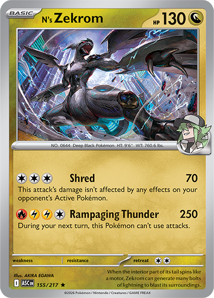 N’s Zekrom is an absurdly strong card that will redefine how the N’s Zoroark ex archetype is built. The current version of this archetype was popularized by Liam Halliburton, using Toedscruel and Mega Lopunny ex to counteract two bad matchups: Gholdengo ex and Cornerstone Mask Ogerpon ex, respectively. Instead of this package, you can rely on N’s Zekrom to take care of both issues. Its first attack, Shred, does 70 damage and goes through opposing effects. Cornerstone Mask Ogerpon ex cannot block this damage. Its second attack deals with Gholdengo ex and other mid-HP Pokémon ex. It does a flat 250 damage, which can one-hit KO Gholdengo ex when paired with Vitality Band or another card that adds 10 damage. With N’s Zekrom, you can instead match pace with Gholdengo ex rather than rely on Toedscruel to win a long, defensive battle.