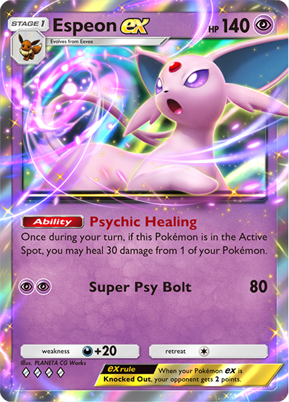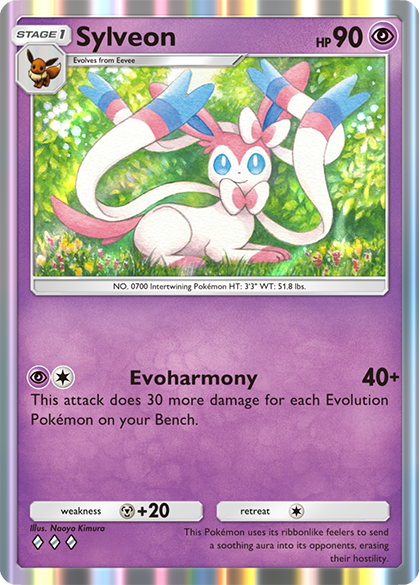 Espeon ex and Sylveon ex can both do decent damage with their attacks, but it’s their Abilities that make them a powerful pair in play. Espeon ex’s Psychic Healing Ability is a consistent source of healing for your Pokémon as long as Espeon ex is in the Active Spot. Since Psychic Healing can target any of your Pokémon, you might choose to heal damage from a Benched Pokémon, saving it from being a target for Cyrus. It can come in handy against Pokémon with Abilities that do damage, too, such as Darkrai ex and Greninja. With Psychic Healing, Espeon ex can also heal itself to tank attacks from powerful Pokémon that might otherwise be able to knock it out in one hit. Oricorio’s Safeguard Ability, which prevents damage from Pokémon ex, is still prominent in competitive play, so many players opt to include non-ex Pokémon in their decks to circumvent it. Despite not being Pokémon ex, Espeon and Sylveon still bring plenty of utility to this deck strategy. Espeon’s Energy Crush attack packs a powerful punch if your opponent has an abundance of Energy in play. And Sylveon can become this deck’s most reliable attacker once you start getting Evolution Pokémon onto your bench—its Evoharmony attack can do a whopping 130 damage for just two